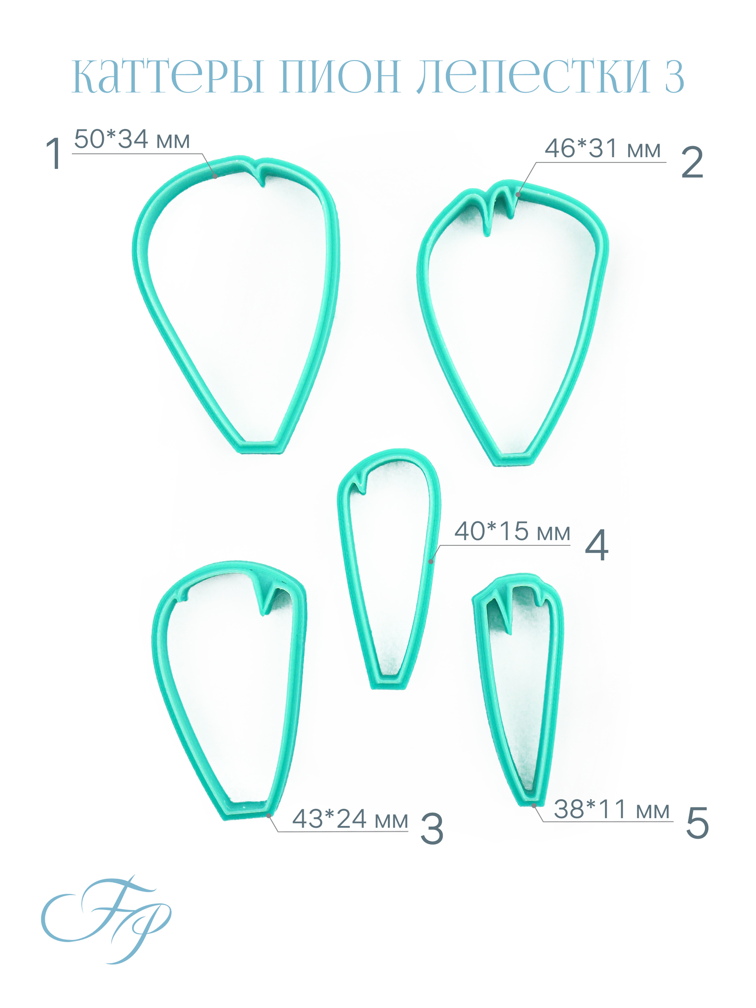 Каттеры лепестка пиона изготовлены методом 3д печати из прочного пластика. Вырубки подходят для полимерных глин, мастики, пластичного шоколада и других материалов со схожими свойствами. По размеру каттеры разработаны так чтобы идеально соответствовать вайнерам,  но при этом они меньше на несколько  миллиметров, что дает возможность утоньшить край листа перед отпечатыванием фактуры на молде для получения максимально реалистичного результата.